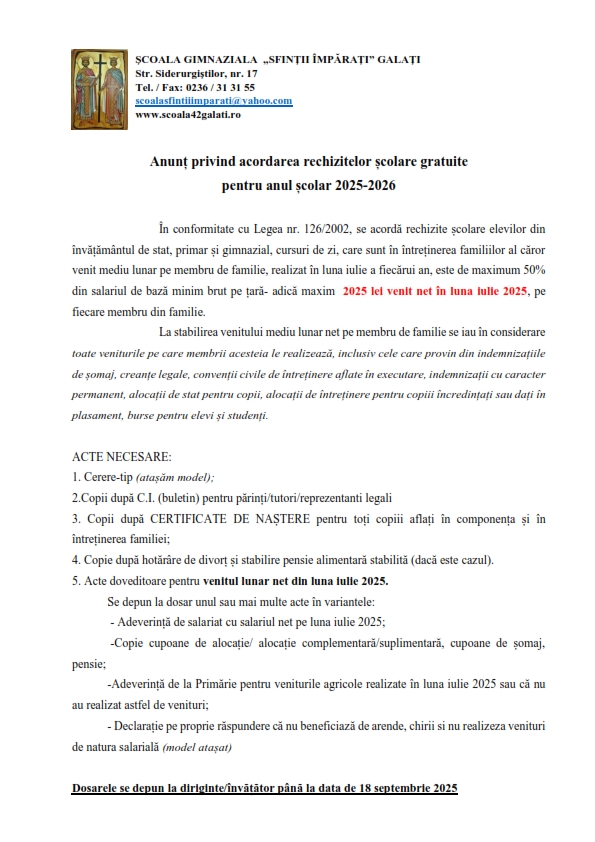 - elevii din ciclul primar și gimnazial înscriși în unități de învățământ de stat care sunt în întreținerea familiilor al căror venit mediu net lunar pe membru de familie, realizat în luna iulie a fiecărui an, este de maximum 50% din salariul de bază minim brut pe țară (maxim 2025 lei).